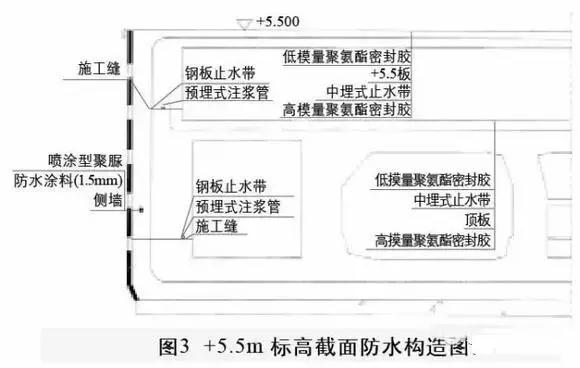 頂部收頭至+5.5板頂邊緣(非變形縫處涂層不需加厚),需設置低模量聚氨酯密封膠封邊;底部收頭需至底板倒角下口。