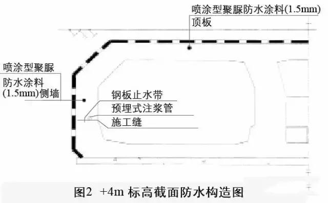 噴涂聚脲防水涂料范圍為所有+5.5m標高以下的結構(不包括+5.5m板頂面)迎水面,包括外側墻表面、+4m標高板頂面等。詳見圖2、圖3。