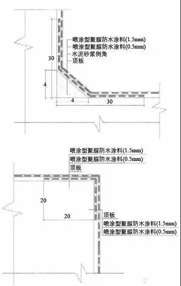 陰角處平、立面各30cm范圍內聚脲涂層厚度為2mm,陽角處平、立面各20cm范圍內聚脲涂層厚度為2mm。