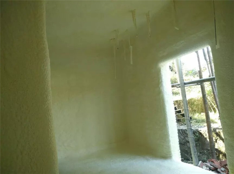 從工程實踐可以看出,基層墻體溫度對聚氨酯的發泡效率也有很大的影響。噴涂過程中,如果環境溫度和建筑物基層墻體溫度都非常低,硬泡聚氨酯第一遍噴涂完后,反應熱量會迅速被基層吸收,從而減少了材料的發泡量。因此,在施工時應盡量縮短中午休息時間,在施工安排過程中宜合理安排工序,以保證硬泡聚氨酯的發泡率。硬質聚氨酯泡沫是異氰酸酯和組合聚醚雙組分混合反應生成的高分子產品。其中異氰酸酯組分很容易和水反應生成脲,如果聚氨酯中脲鍵含量升高,則泡沫塑料將變脆,泡沫與基材的粘結力降低。因此,要求待噴基材表面清潔干燥,相對濕度小于80%,且無銹、無粉塵、無污染、無潮氣,雨天不得施工。若有露或霜,應予以去除和干燥。
