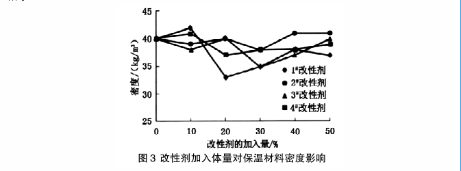 由圖3可知,不同的改性劑對保溫材料的密度會有影響,但是影響程度不大,材料密度基本維持在35kg-42kg/m3。由此可得出結論,改性劑的種類不同并不會增加新型聚氨酯保溫材料的密度,對材料生產制造成本不會有太多影響。